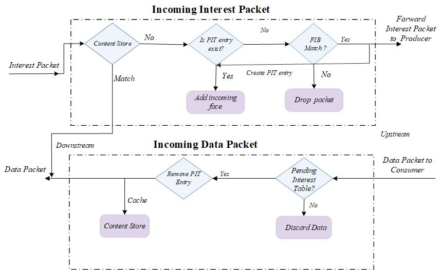 The NDN forwarding process is presented in Fig. 1. NDN follows a pull-based model of communication, and the application layer name