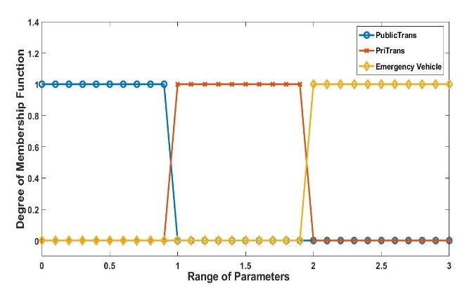 Eq. (6) shows the membership function of an emergency vehicle. $\mu _{vt,emergency}\left(vt\right)~