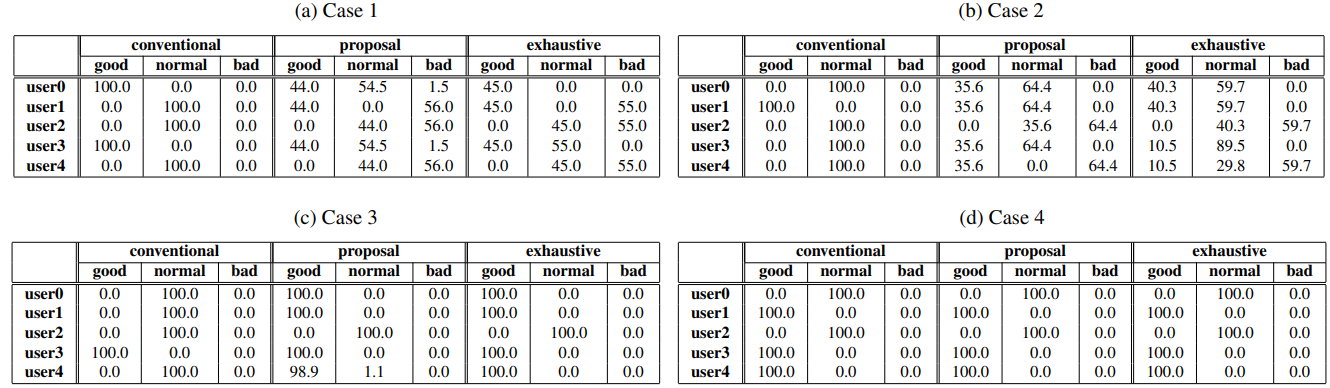 Table 7. Achievement rates from actuator parameters and the total reward, compared with exhaustive search when there are 10 users.