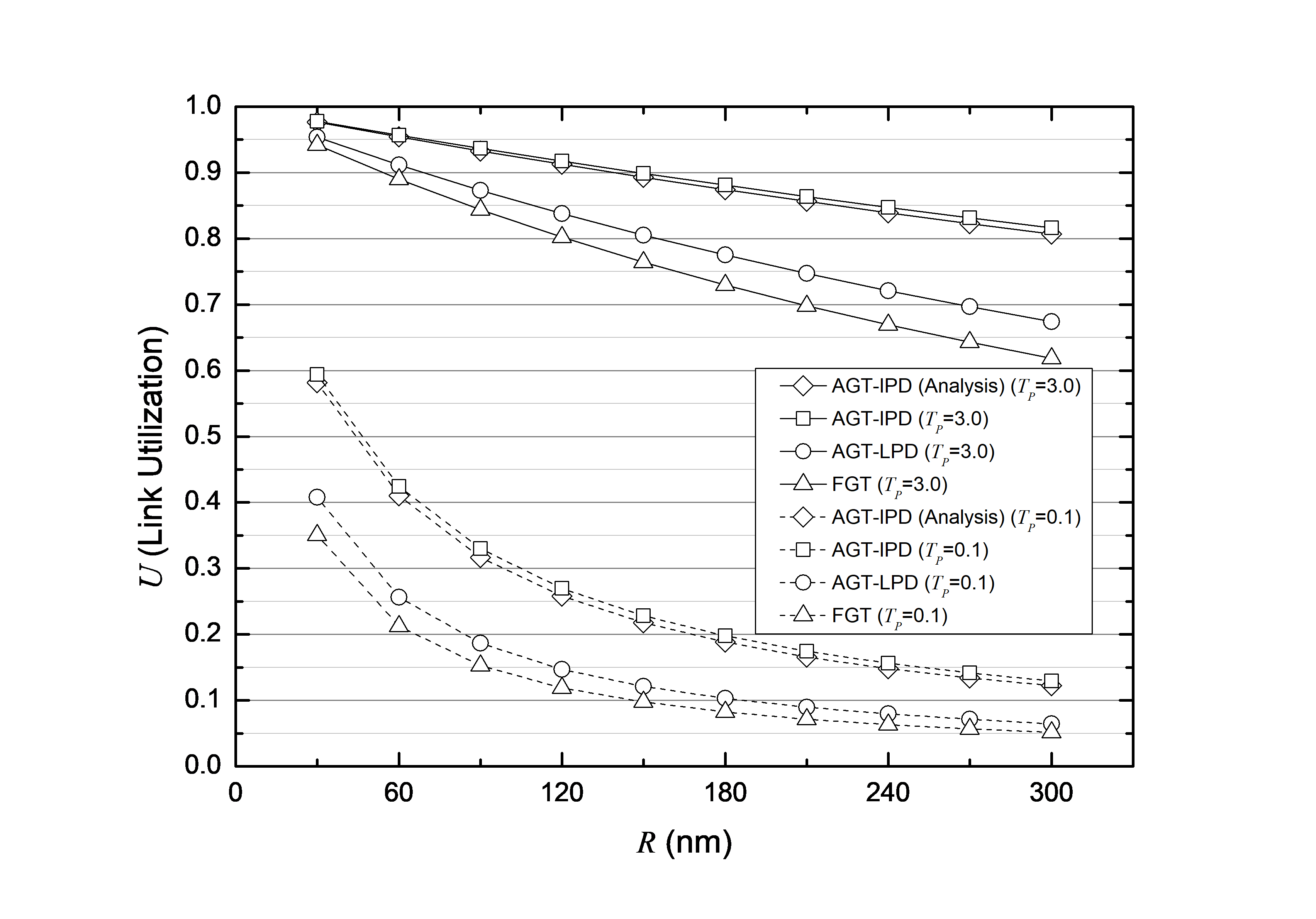 Fig. 2. Comparison of link utilizations according to TP (R = 300 nm, N = 216, $e_{MAX}$ = 0).