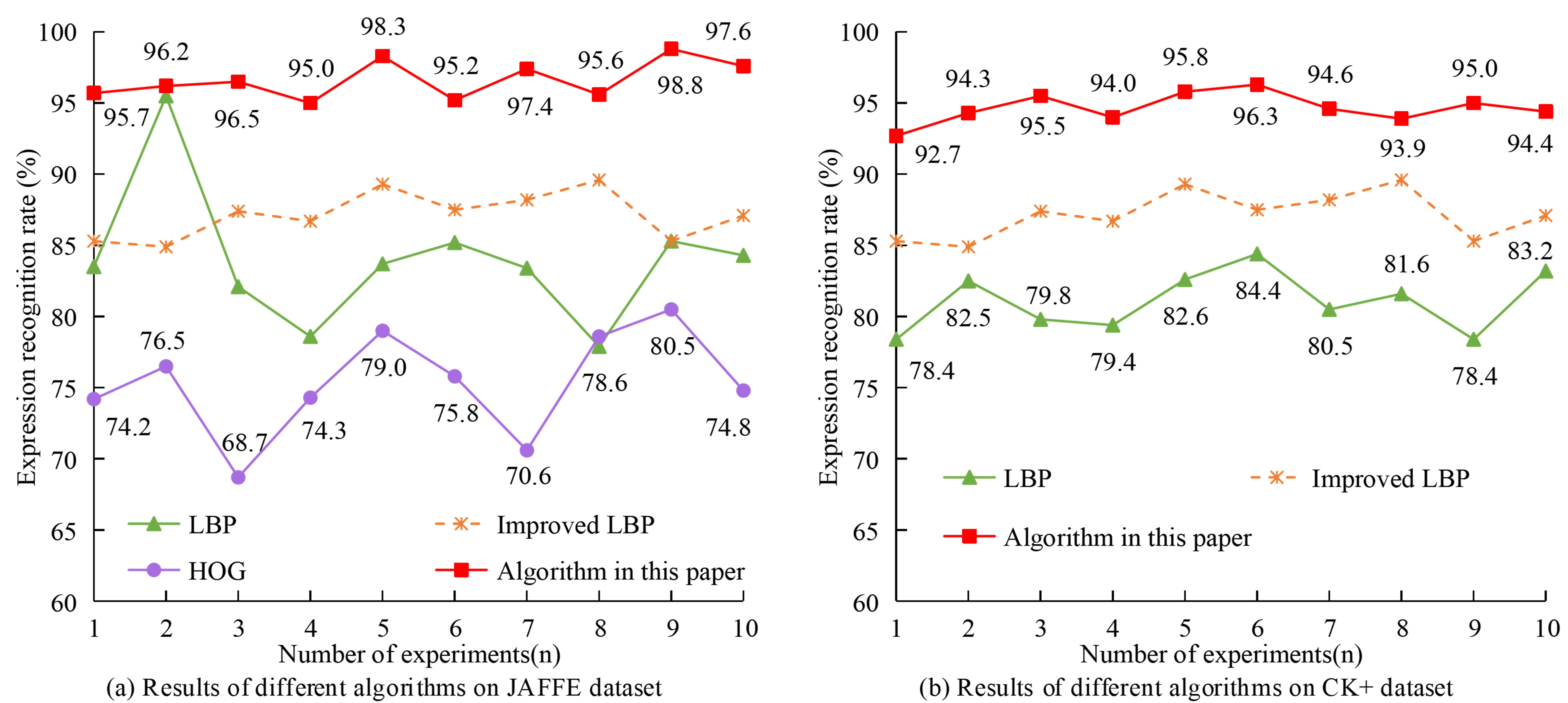From Fig. 8(a), the average recognition rate of the improved LBP is about 3% higher than that before