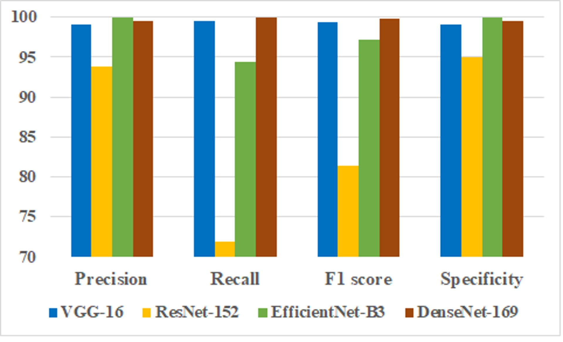 • The proposed model, fine-tuned DenseNet-169 excels in performance and efficiency