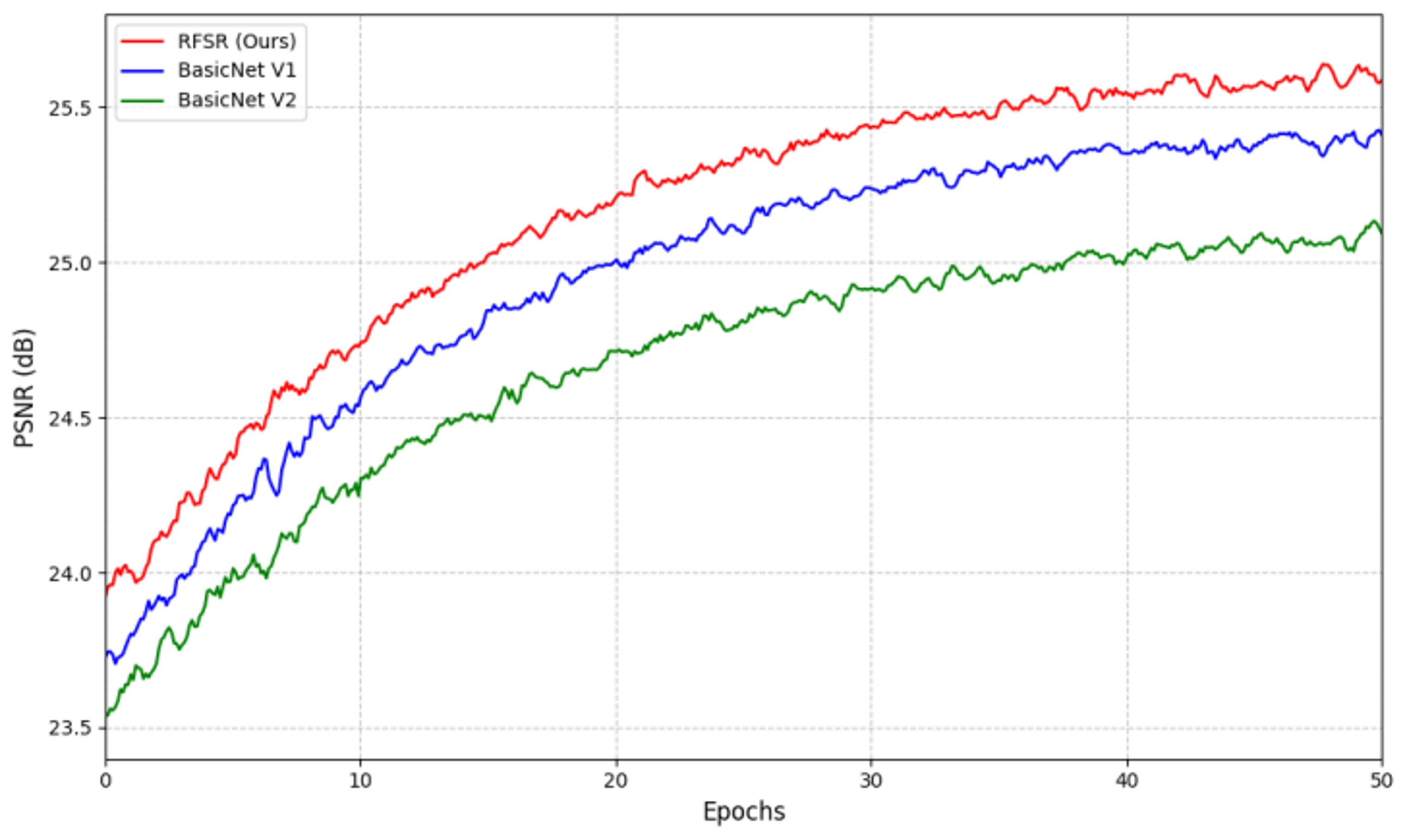 a more gradual increase in PSNR. However, the full RFSR model maintains a slightly