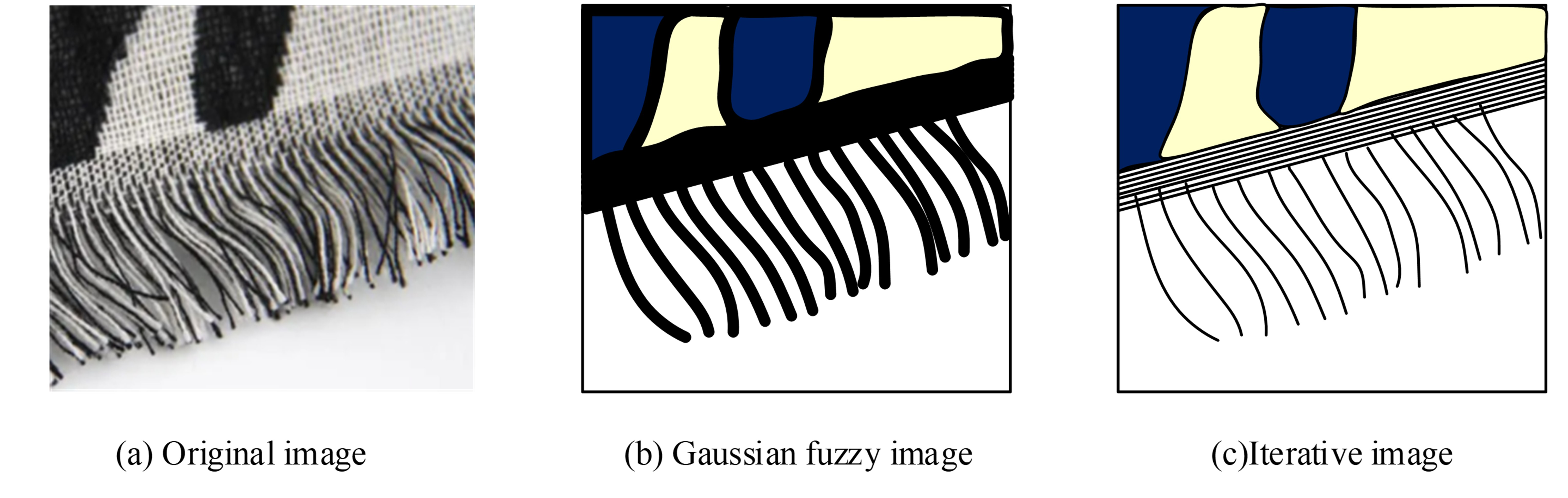 Fig. 3 shows the edge extraction of silk fabric patterns. Fig. 3(a) shows the original image of silk fabric. Fig. 3(b) presents the extraction results of the Sobel operator. Fig. 3(c) shows the regional gradient information. Fig. 3(d) shows the fabric image after texture elimination. From this image, the original silk