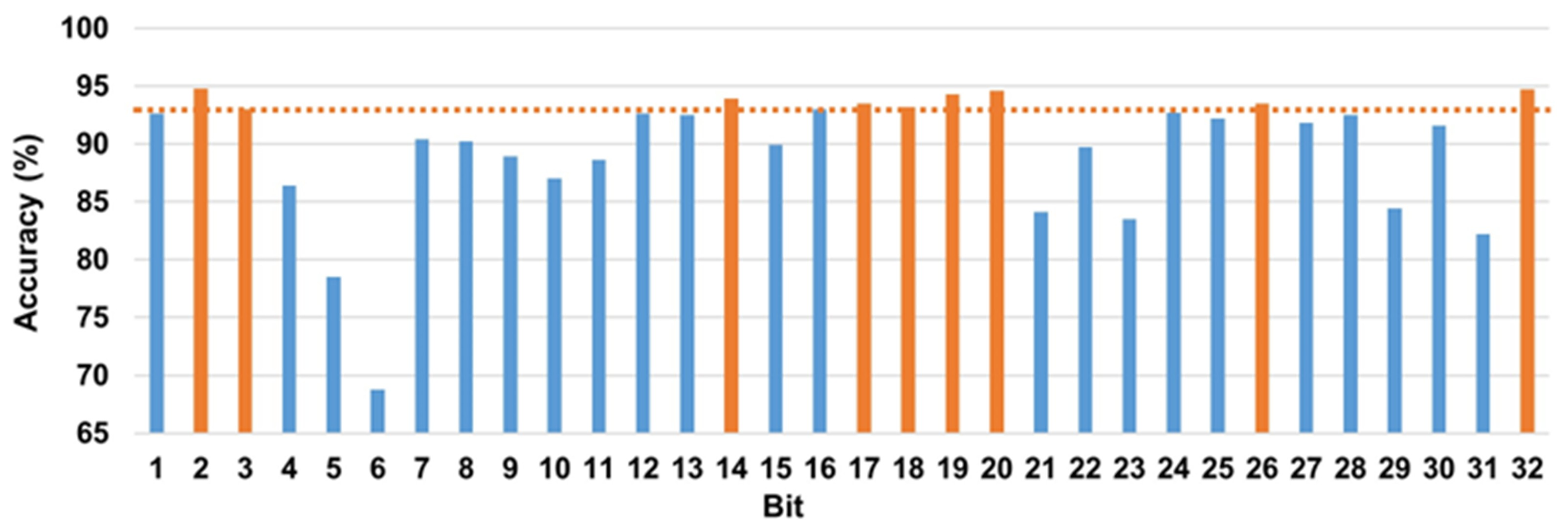 32nd bit exhibits a high accuracy of 94.7%. In contrast, the 6th bit shows a much