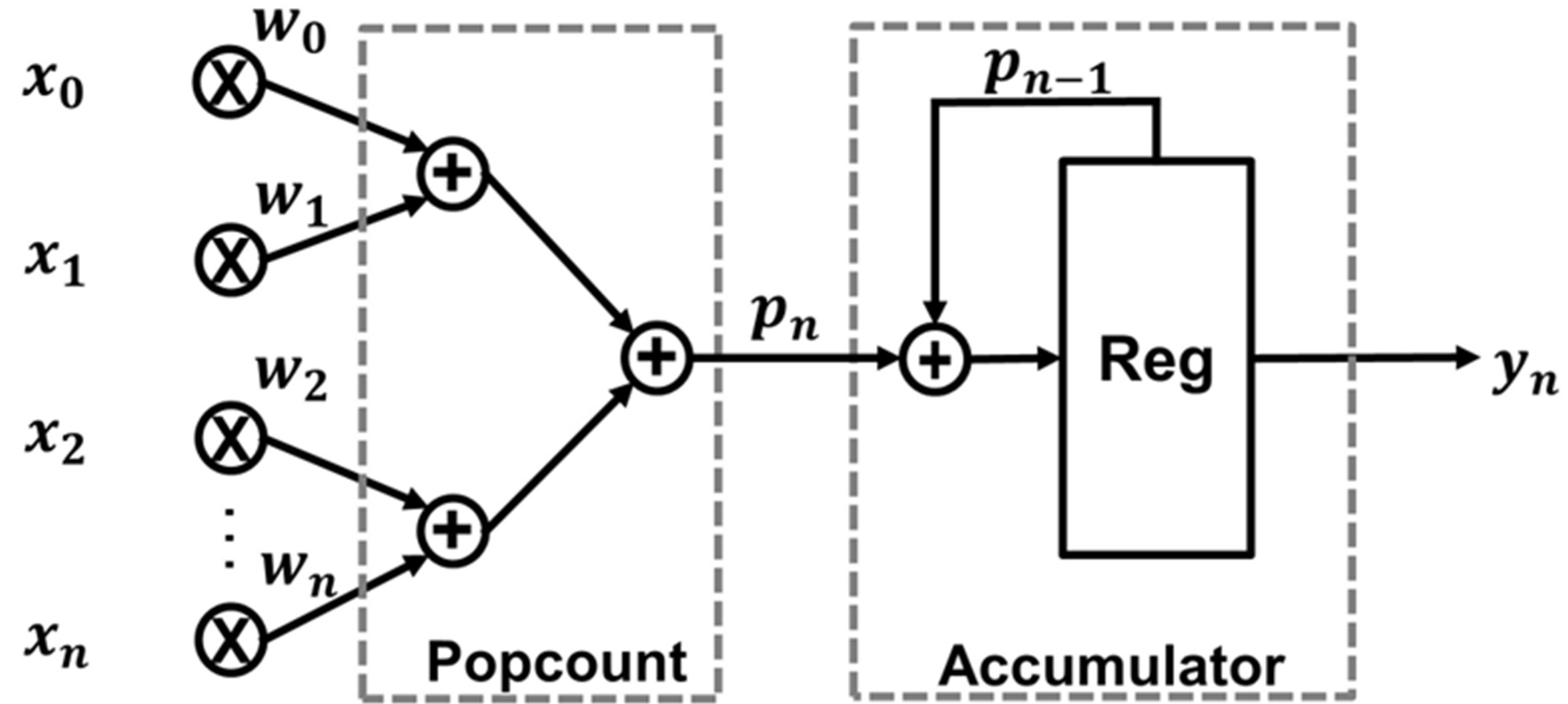 accumulator accumulates the binary dot product of the previous layer’s output values