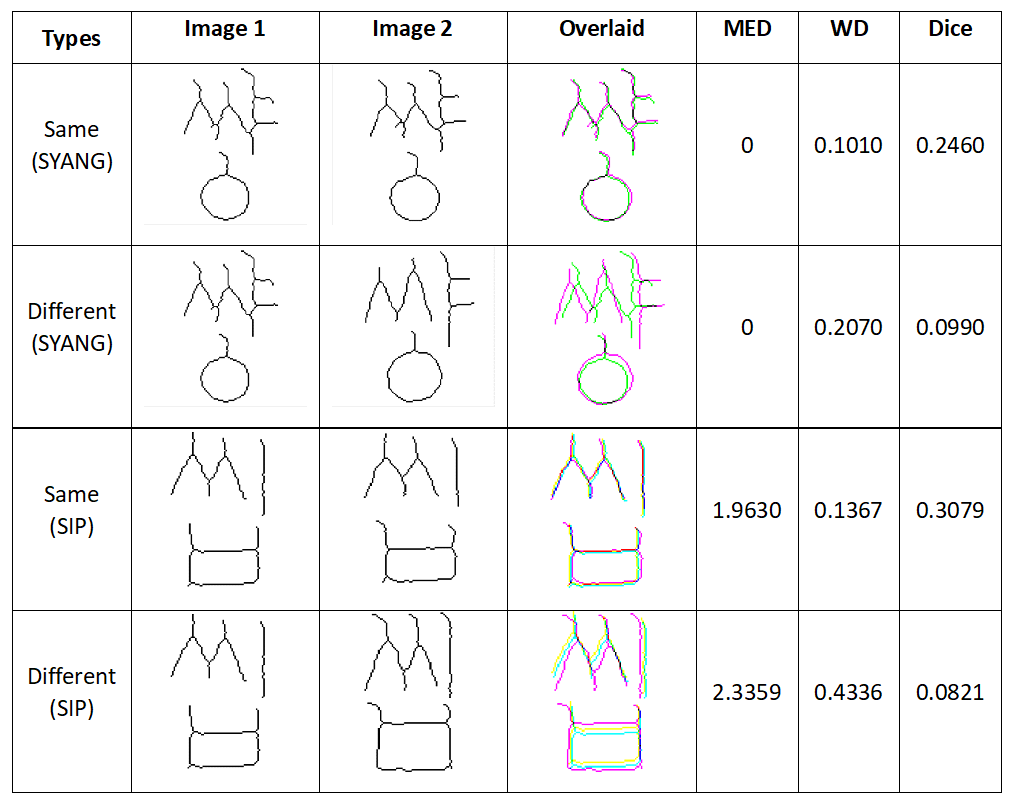 similarity between images, such as the mean average distance, Dice coefficient, and
