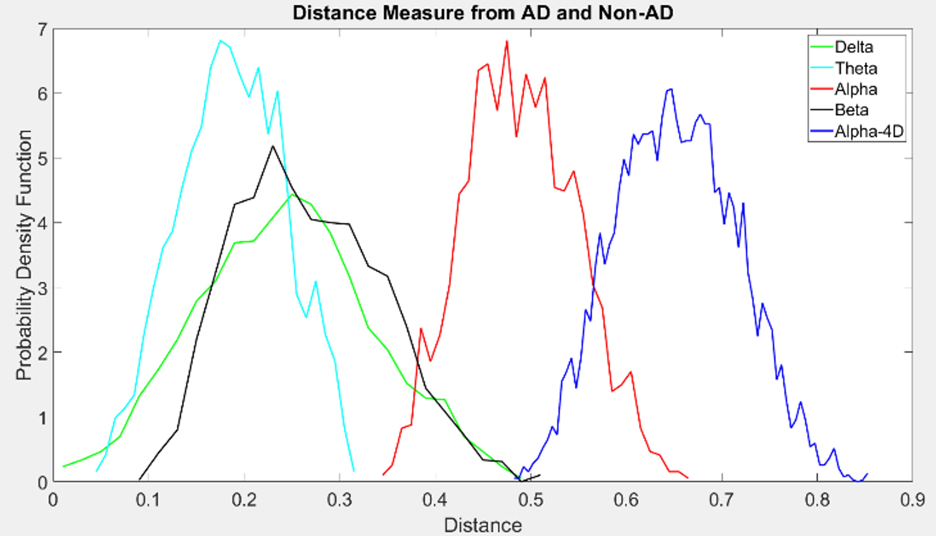 normal subjects (NS) and AD patients, the interclass distance (Dist) is calculated