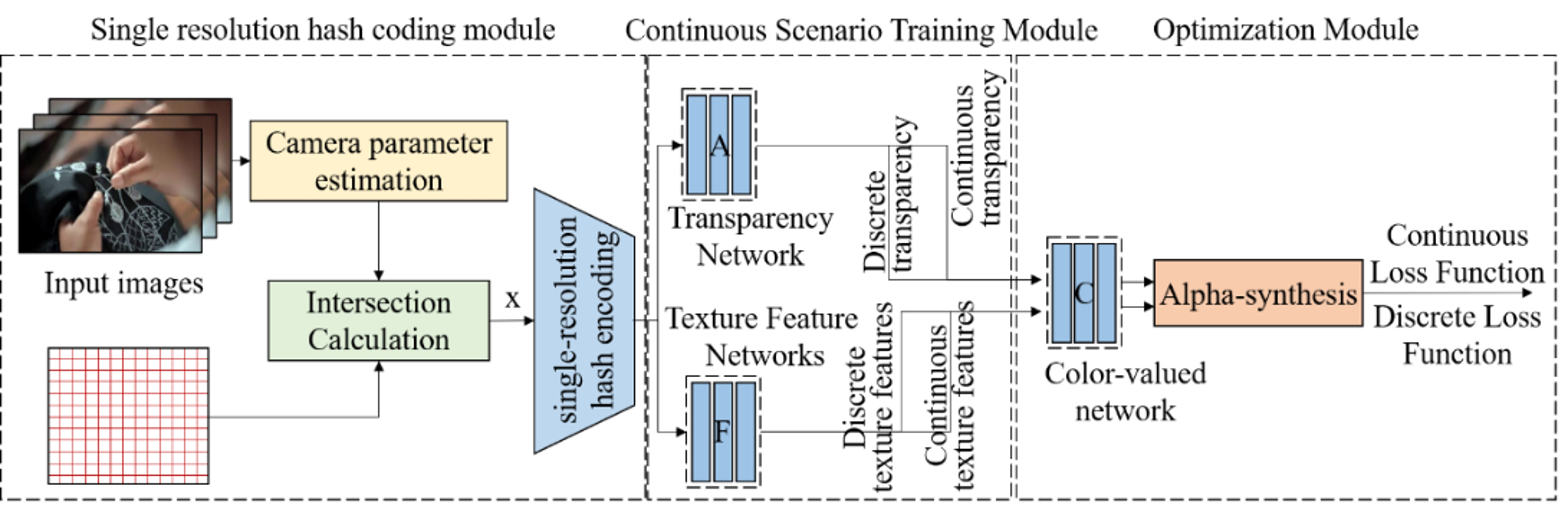 single-resolution hash coding module, a continuous scene representation training module,