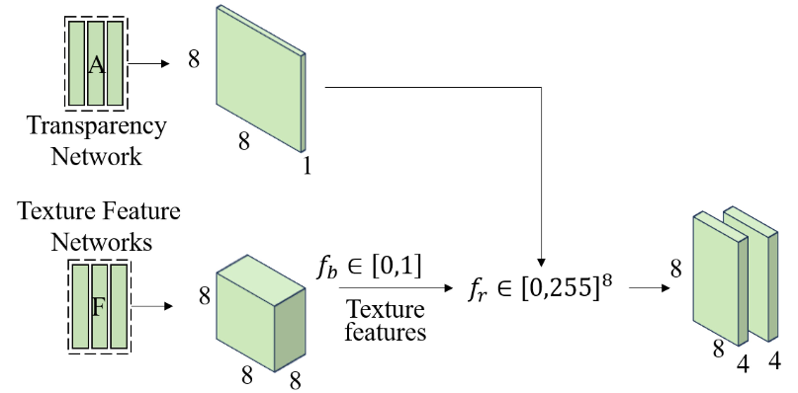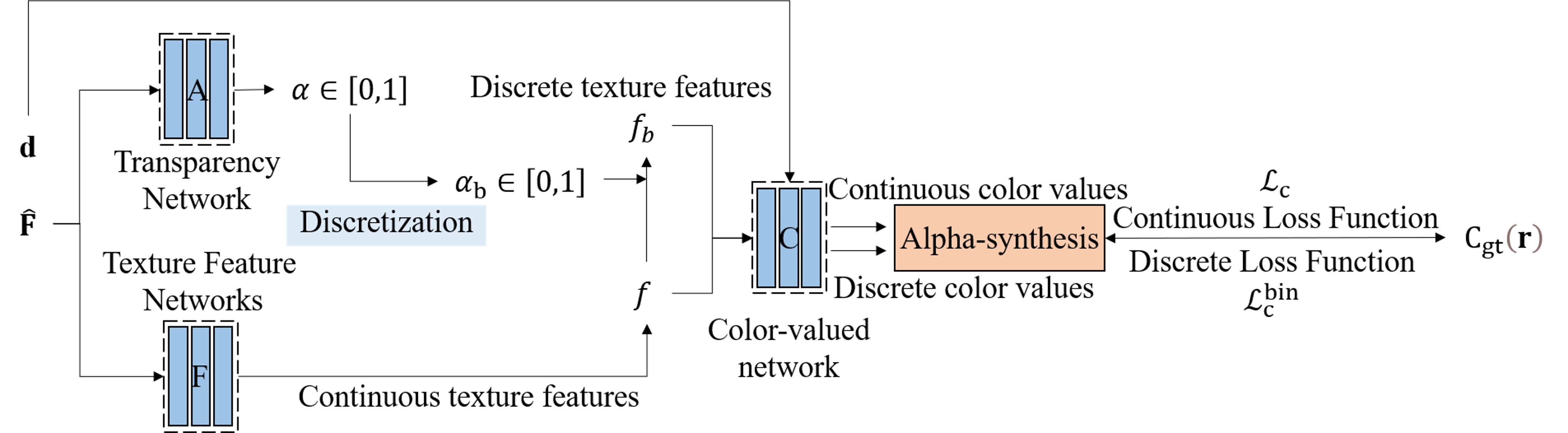small MLPs to output the transparency $\alpha$, texture feature vector f, and color