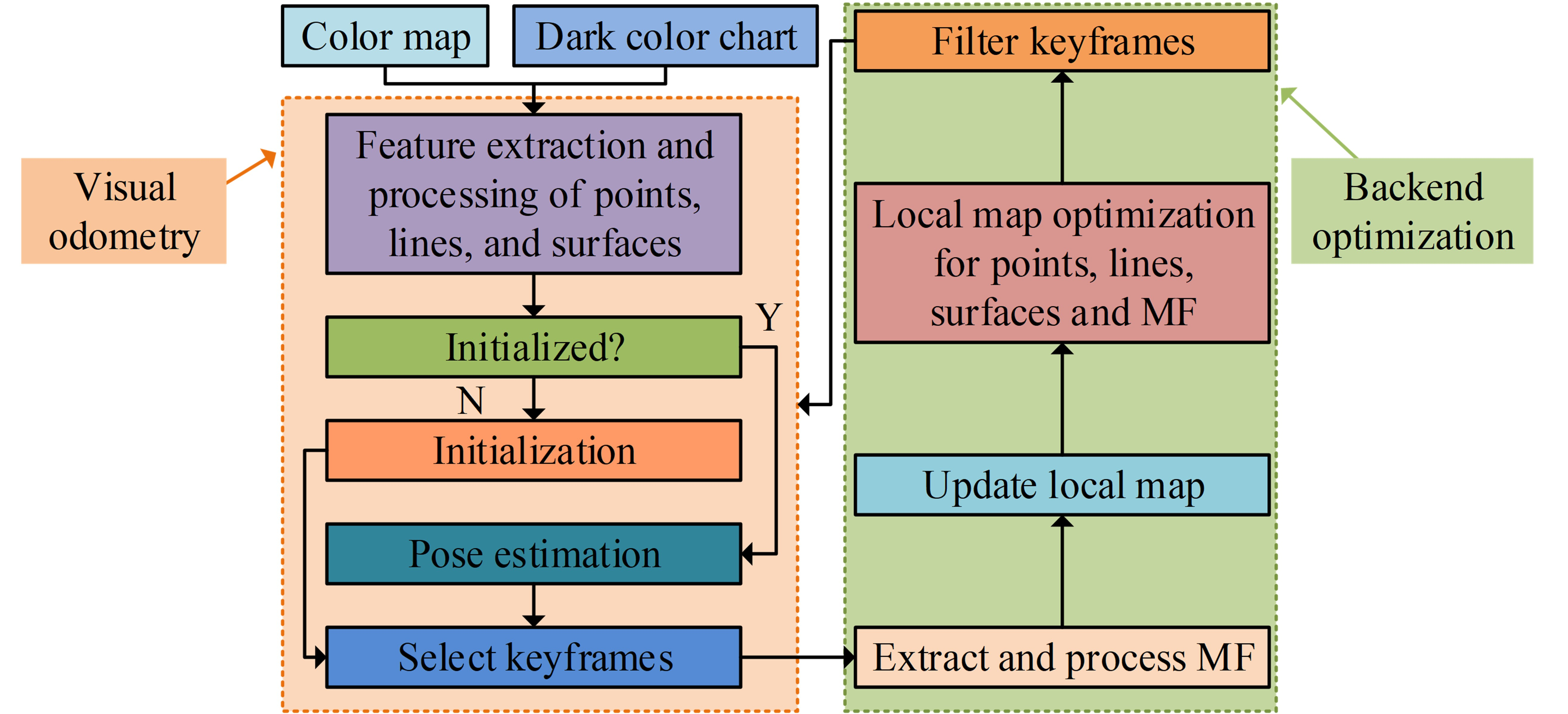 point, line, and surface features, pose estimation, and keyframe selection. Meanwhile,